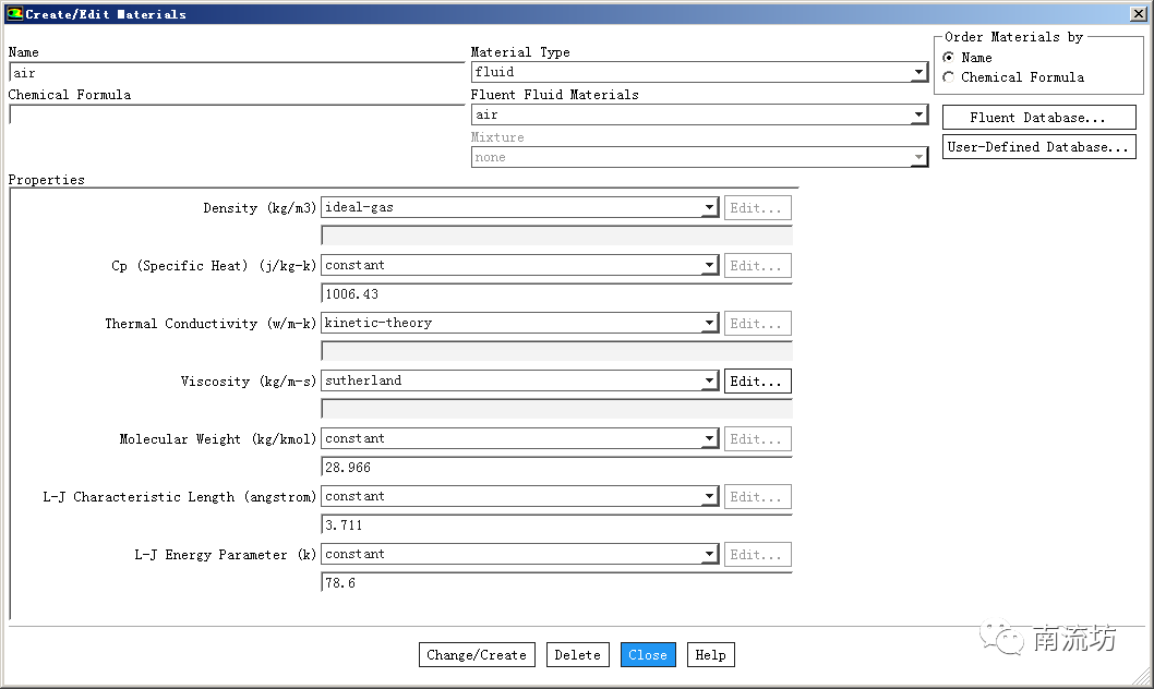 物质属性:物质密度为理想气体,摩尔数为28.966,粘度为Sutherland’s law,比热为1006.43J/kg-K