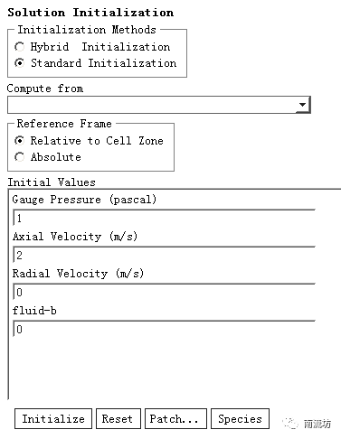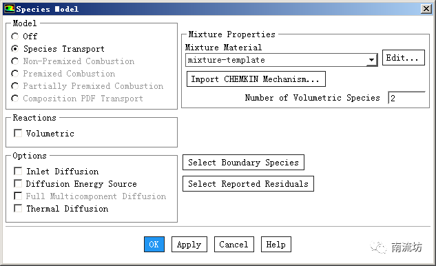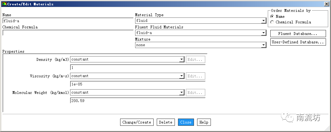 物质属性:物质A,密度为1kg/m3,粘度为1e-5kg/m-s,扩散系数为1.43e-5m2/s;物质B,密度为1kg/m3,粘度为1e-5kg/m-s,扩散系数为1.43e-5m2/s