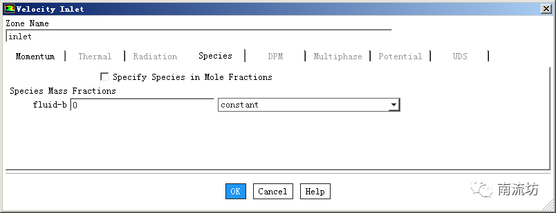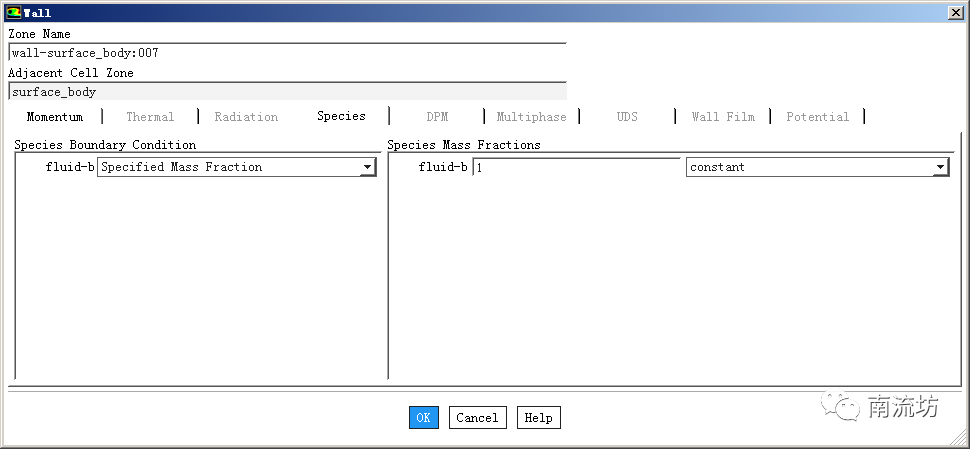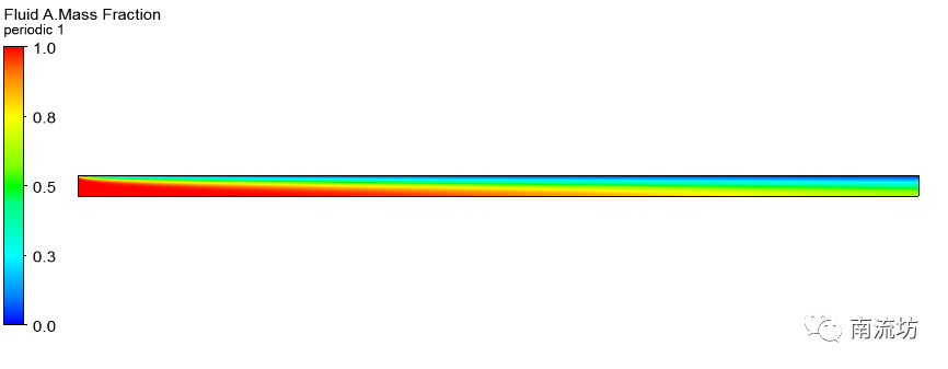边界条件:来流速度1m/s,物质A在入口处质量百分比为1,物质B在壁面的质量百分比为1