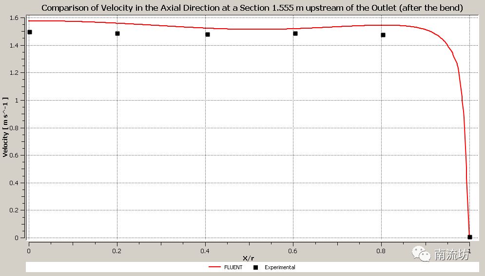 距离出口1.555m处(拐弯段与直线段相连处)速度值对比图表