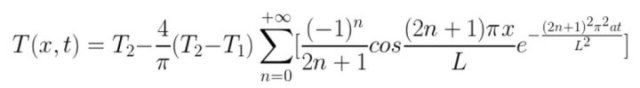 不妨考虑一简单模型。假设所加入的生肉片是面积较大,厚度为L的均匀薄片,如果忽略边缘效应,就可以只考虑肉片中的温度沿肉平面的法线方向的分布了(或者说,认为同一平面上各点的温度相同),这样,我们就可以用下面这个一维热传导方程来解决这一问题。
