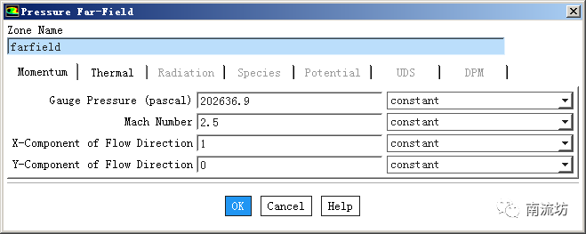 边界条件:来流压力为202636.9 Pa,马赫数为2.5,温度为300K,墙壁为绝热条件