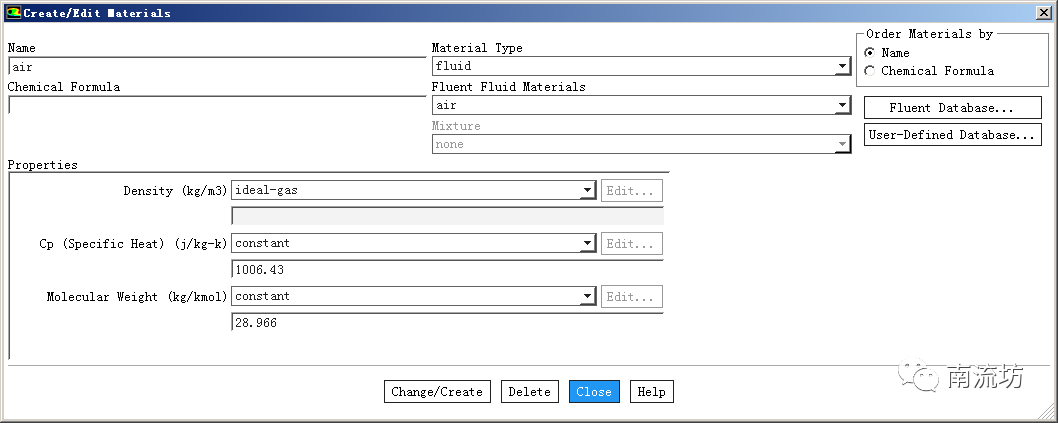 计算域内流体物质为空气,设置它的密度、比热、摩尔数等参数