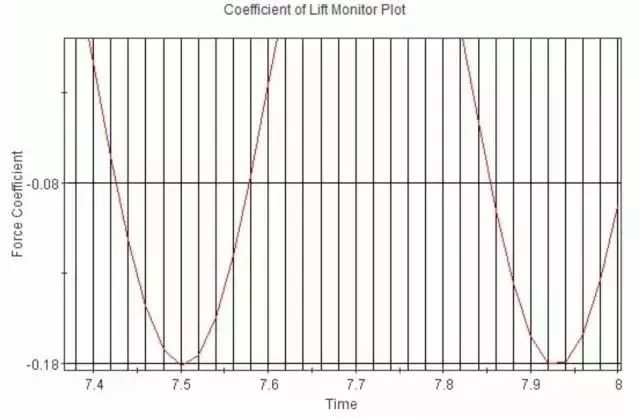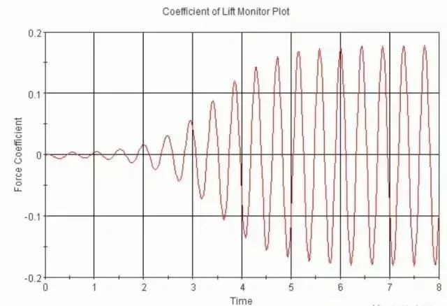 在本例中,计算得到斯特劳哈尔数 0.15。因此, 计算的涡流脱落的理论频率是 2.25 Hz,其周期为 0.444 秒。