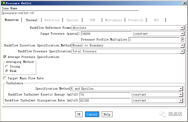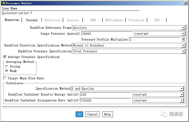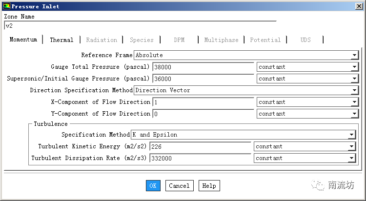 气流(2):总压37.6kPa,静压36 kPa,温度290 K,马赫数0.36,湍动能226 m2/s2,湍流耗散率332000 m2/s3