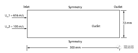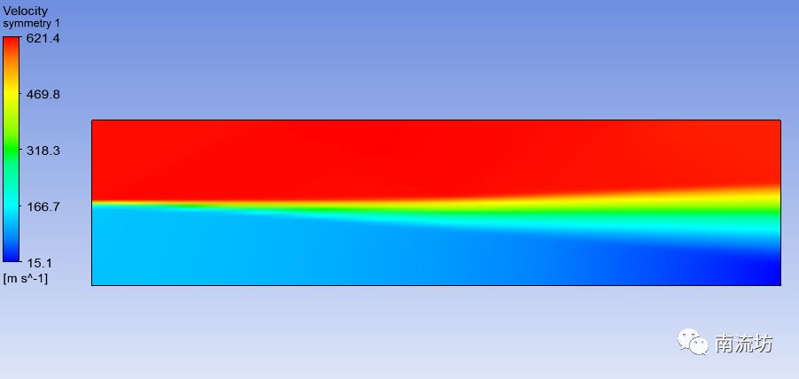 注意:这里左侧为压力入口边界,平均分为上下两个部分,上方为气流1流入,下方为气流2流入,同样,在右侧压力出口处也分为上下两个部分。