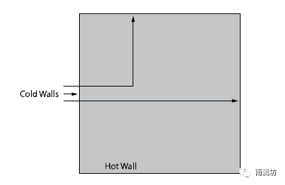 本案例介绍了方腔内热传导和辐射耦合计算。材料属性设置为传导辐射参数N=1,介质的散射系数为0。方形腔的一个壁面设置为高温,其他壁面设置为低温。