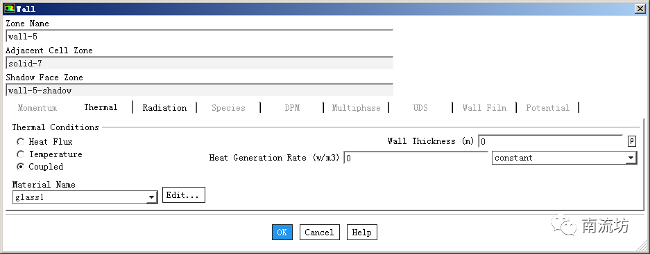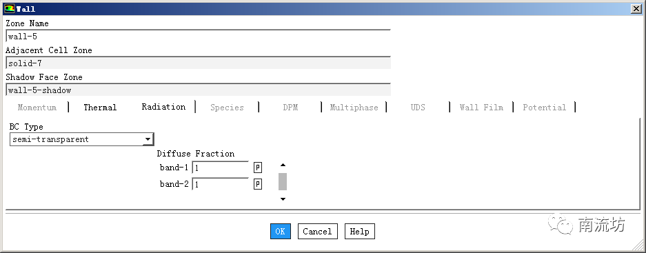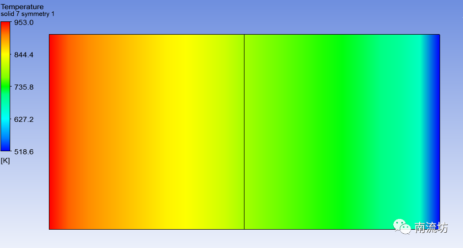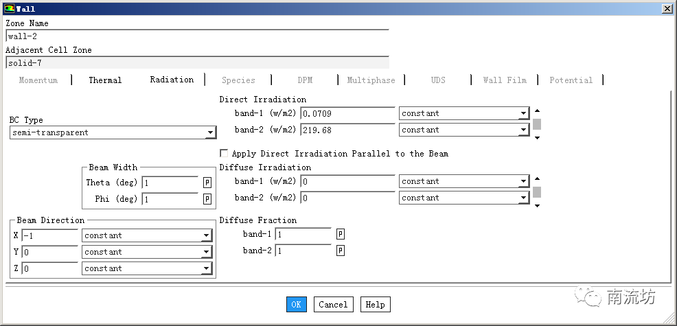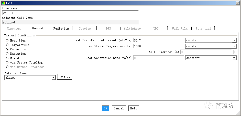 边界条件:左侧壁面:Convective Heat Transfer Coefficient =56.7 W/m2 K,free stream temperature =1000K,Semi-transparent
