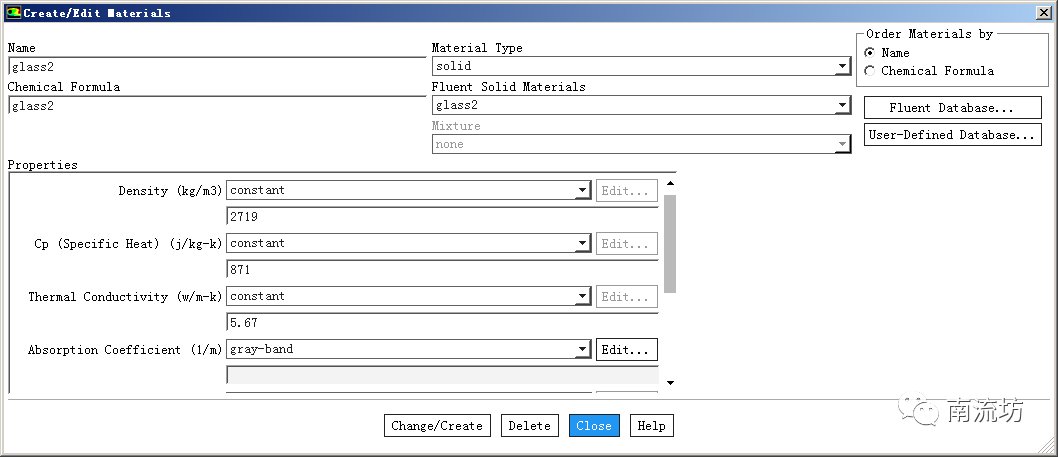 固体域2:密度2719kg/m3,Specific Heat = 871 J/kg-k,Thermal Conductivity =5.67 W/m-K,Absorption Coefficient: gray-band,Refractive Index = 3