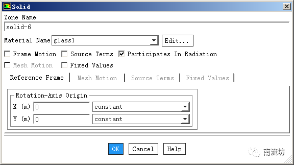 物质属性:固体域1:密度2719kg/m3,Specific Heat = 871 J/kg-k,Thermal Conductivity =5.67 W/m-K,Absorption Coefficient: gray-band,Refractive Index = 1.5