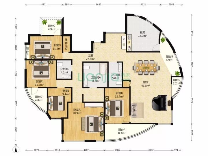 这是一个五室两厅一厨三卫六阳台,东南西北全通透的霸气豪宅!