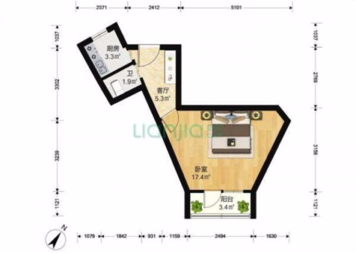 该房为一室一厅一厨一卫的小面积户型,房屋功能虽然齐全,但布局古怪清奇,特别像一个马桶。