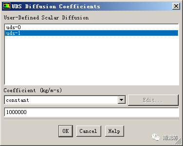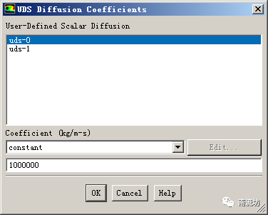 f.UDS Diffusivity选择define-per-uds,在弹出的UDS Diffusivity Coefficients对话框中,设定uds-0和uds-1的Coefficient均为1.0e6。