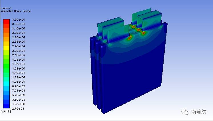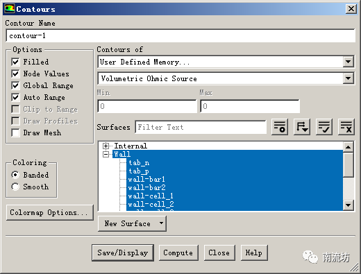 Contous of选择User Defined Memory和Volumetric Ohmic Source,在Surface Types中选择wall,单击Display按钮,显示云图。