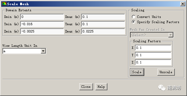 (6)单击主菜单中Mesh→Scale按钮,弹出如图5所示Scale Mesh(网格缩放)对话框。在Scaling中,选择Special Scaling Factors,在Scaling Factors X,Y和Z中分别输入0.1,单击Scale完成网格缩放。