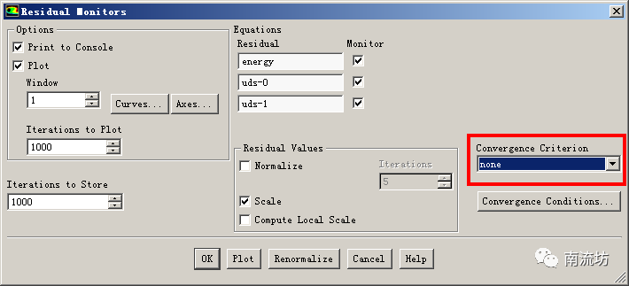 (3)单击主菜单中Solve→Monitors按钮,弹出Monitors(监视)面板,双击Residuals-Print, Plot便弹出Residual Monitors(残差监视)对话框,在Convergence Criterion中选择none。