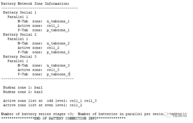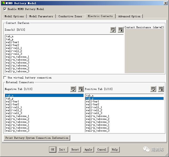 (6)在Electric Contacts选项卡中,点击Print Battery System Connection Information按钮,将在文本信息框中显示如下信息。确认后,点击OK按钮关闭MSMD电池模型对话框。