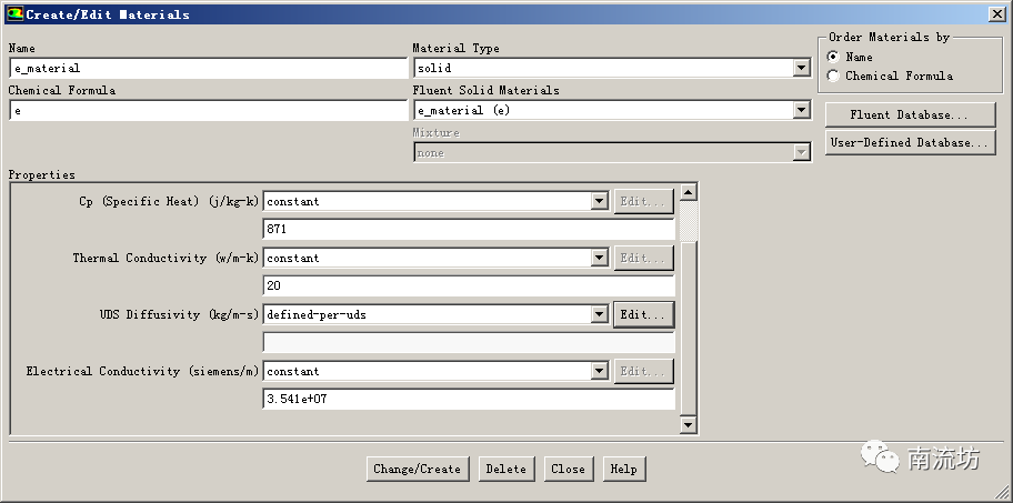 (2)在物性参数设定对话框中,按照以下参数设定新物质e_material。