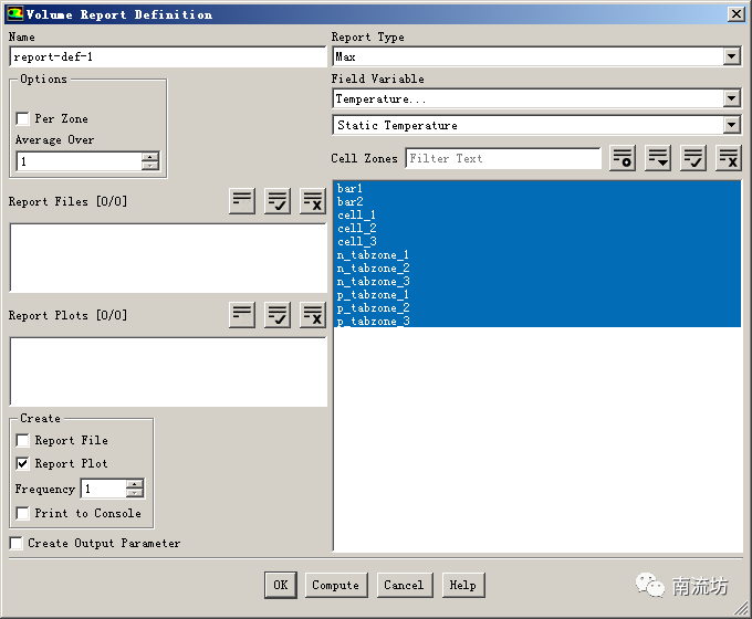 勾选Plot,在Report Type 中选择max,在Field Variable中选择Temperature和Static Temperature,在Cell Zones中选择全部,单击OK按钮确认。