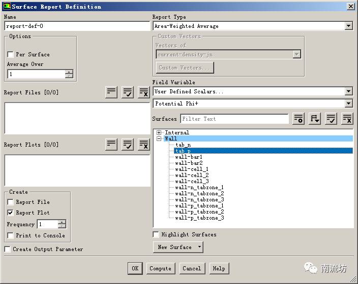 勾选Plot,在Report Type 中选择Area-Weighted Average,在Field Variable中选择User Defined Scalars和Potential Phi+,在Surface中选择tab_p,单击OK按钮确认。
