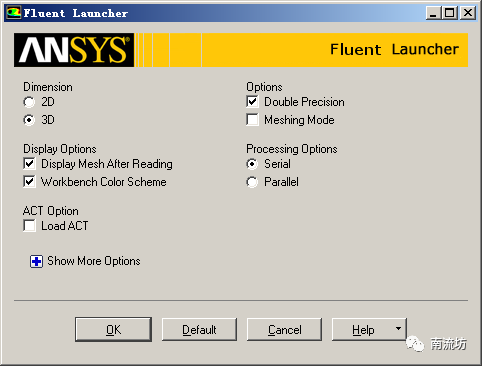 (2)在FLUENT Launcher界面中的Dimension中选择3D,在Display Options中勾选Display Mesh After Reading,Embed Graphics Windows和Workbench Color Scheme,单击OK按钮进入FLUENT主界面。