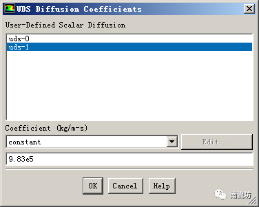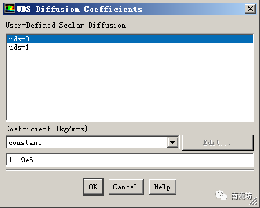 f.UDS Diffusivity选择define-per-uds,在弹出的UDS Diffusivity Coefficients对话框中,设定uds-0的Coefficient为1.19e6,uds-1的Coefficient为9.83e5