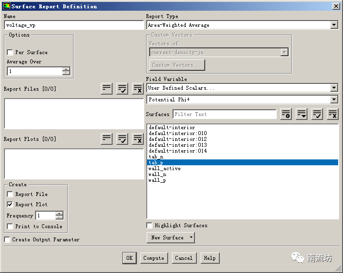 勾选Plot,在Report Type 中选择Area-Weighted Average,在Field Variable中选择User Defined Scalars和Potential Phi+,在Surface中选择tab_p,单击OK按钮确认。