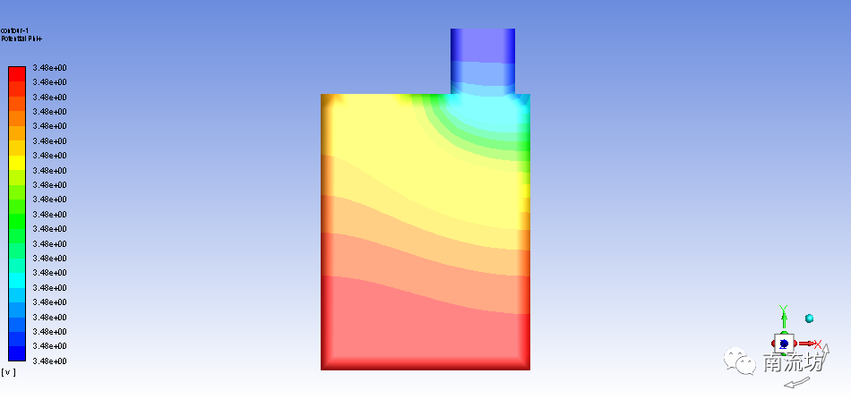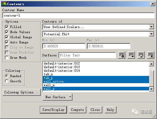 Contous of选择User Defined Scalars和Potential Phi+,在surfaces中选择tab_p,wall_active和wall_p,单击Display按钮,显示云图。