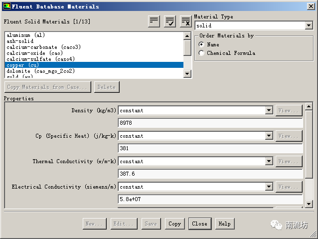 (4)单击FLUENT Database按钮,弹出所示FLUENT Database Materials(材料数据库)对话框。在Material Type中选择solid,在FLUENT Solid Materials中选择copper,单击Copy按钮确认,单击Close按钮退出。