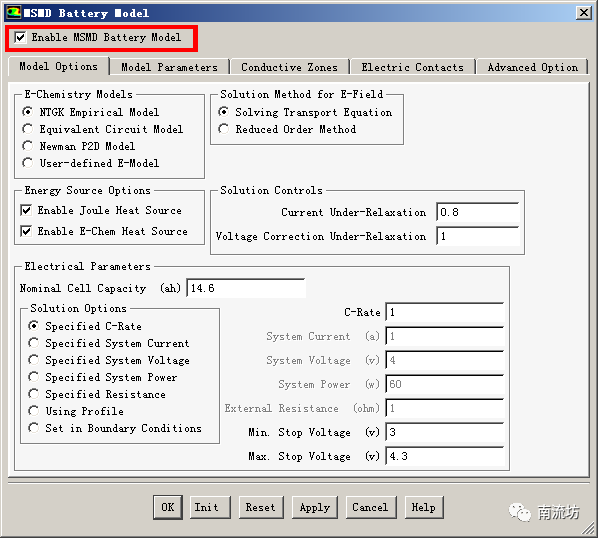 (3)在模型设定面板双击MSMD Battery Model按钮,弹出MSMD Battery Model(MSMD电池模型)对话框,勾选Enable the battery model激活MSMD电池模型。