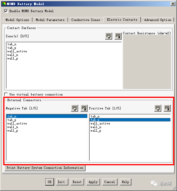 (6)在Electric Contacts选项卡中,点击Print Battery System Connection Information按钮,将在文本信息框中显示如下信息。确认后,点击OK按钮关闭MSMD电池模型对话框。