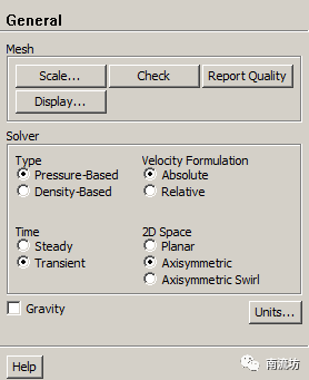 (1)单击主菜单中Define→General按钮,弹出General(总体模型设定)面板。在Solver中,Time类型选择Transient。