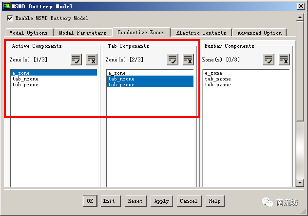 (4)在Conductive Zones选项卡中,按照下图进行选择。注意:对于这种单电池的情况,没有母线区,因此不需要特别设定。