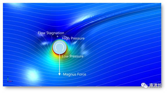 根据伯努利定理,流体速度增加将导致压强减小,流体速度减小将导致压强增加,这样就导致旋转物体在横向的压力差,并形成横向力。同时由于横向力与物体运动方向相垂直,因此这个力主要改变飞行速度方向,即形成物体运动中的向心力,因而导致物体飞行方向的改变。用位势流理论解释,则旋转物体的飞行运动可以简化为“直匀流+点涡+偶极子”的运动,其中点涡是形成升力的根源。在二维情况下,旋转圆柱绕流的横向力可以用儒可夫斯基定理来计算,即横向力=来流速度 x 流体密度 x 点涡环量。