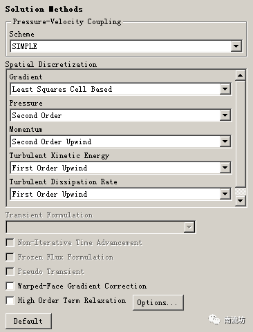 在完成了网格、物理型、材料和边界条件的设定后,原则上就可以开始计算求解了,但为了更好地控制计算过程,提高计算精度,需要在求解器中进行相应的设置。设置的内容主要包括:选择离散格式、设置松弛因子等。