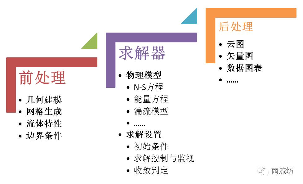 计算流体力学发展到今天,基本理论和数值算法已较为成熟,已经形成了一套较为规范的数值分析方法流程。大多数商业CFD软件也基本是采用类似的思路来进行设计,这些软件通常由具有成熟的处理流体问题的数值算法,用于输入问题参数的友好的用户图形界面和必要的图形数据显示所构成。因此,一般完整的CFD分析软件都提供了计算分析流程中主要的三大要素: