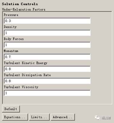 在实际计算中可以用缺省设置先进行计算,如果发现残差曲线向上发展,则中断计算,适当调整松弛因子后再继续计算。在修改计算控制参数前,应该先保存当前计算结果。调整参数后,计算需要经过几步调整才能适应新的参数。一般而言,增加松弛因子将使残差增加,但是如果格式是稳定的,增加的残差仍然会逐渐降低。如果改变参数后,残差增加了几个量级,就可以考虑中断计算,并重新调入保存过的结果,再做新的调整。