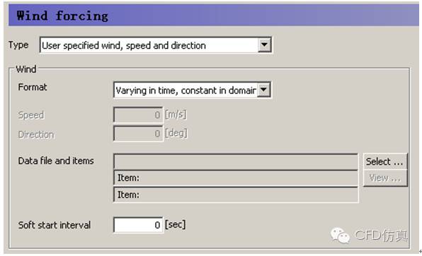 在值随空间变化的情况下,你需要在建立水动力模拟前准备一个包含了风作用力(速度m/s)和方向(从正北算起的角度)或速度(m/s)的数据文件。这个文件为二位数据(dfs2)。数据中的区域需覆盖了整个模型区域,采用双线性插值来形成数据“而且需要指定软启动间隔。