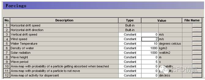 用户指定作用力必须要在对话框中指定,随作用力的空间不同,在模型中可以设置为“contant value”,“Type 0 data file”或“Type 2 data file”。这些数据文件需要覆盖整个模拟阶段。而且如果选择Type 2文件,它必须包括了地形文件的空间范围和坐标系。