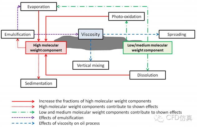 油膜中不同的化学成分通过不同的分子量来表明组分的挥发性,以及如何被风化过程影响。下图表明了这些过程的互相作用以及油的组分。