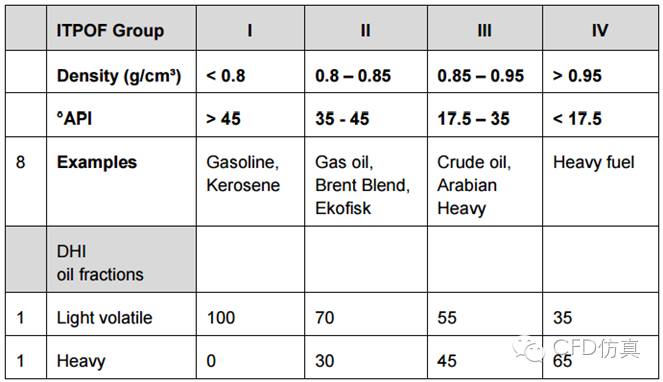 下表中包含了ITOPF分类的四种组分的估计构成,参考海洋溢油归宿(2002)。ITOPF的分类是按照油的密度来定义的。在表格的末尾估计了两种油组分分数的相对分布,这在DHI溢油模型中使用。