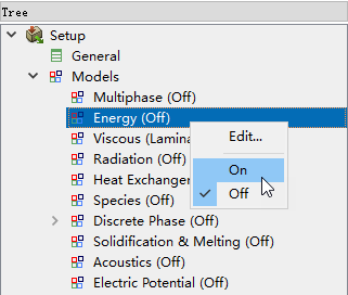 右键选择模型树节点Models > Energy,选择弹出子菜单On