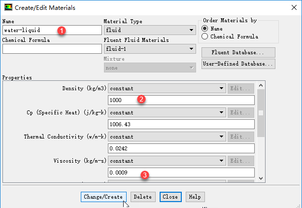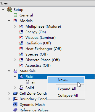 右键点击模型树节点Materials > Fluid,选择子菜单New…打开新建材料对话框
