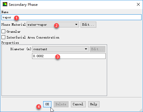 设置Name为vapor,设置Phase Material为water-vapor,设置Diameter为0.0002 m