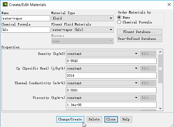 从材料数据库中添加材料water-liquid及water-vapor,并修改参数。