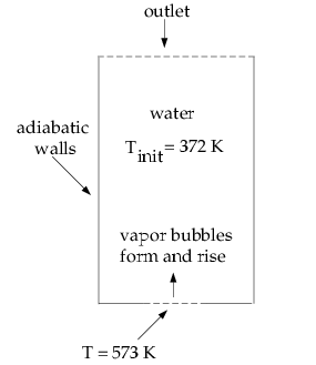 本教程要解决的问题如下图所示。初始状态下,容器中包含有温度接近沸点的水(温度372K),容器底部温度573K,在热传导的作用下,底部壁面附近温度会超过水的饱和温度(373K),此时水会发生相变(沸腾)产生气泡,在浮力的作用下气泡会上升。