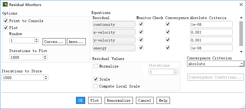 双击模型树节点Monitors > Residual,弹出设置对话框,如下图所示,设置残差标准为0.0001