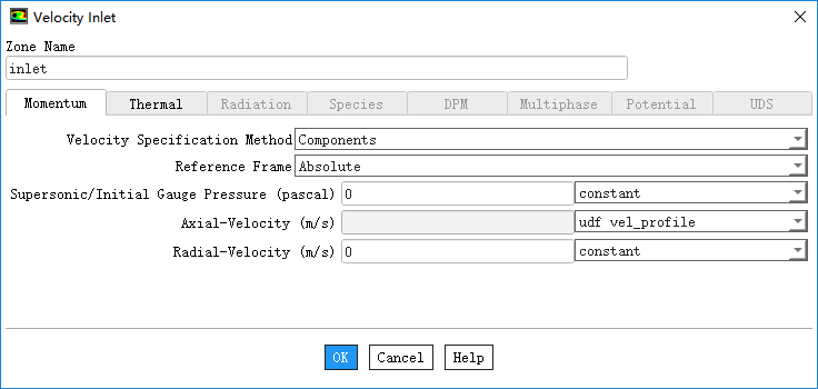 鼠标双击模型树节点Boundary Conditions > inlet弹出设置对话框,选择设置Axial-velocity为udf vel_profile,其他参数默认设置,点击OK按钮关闭对话框