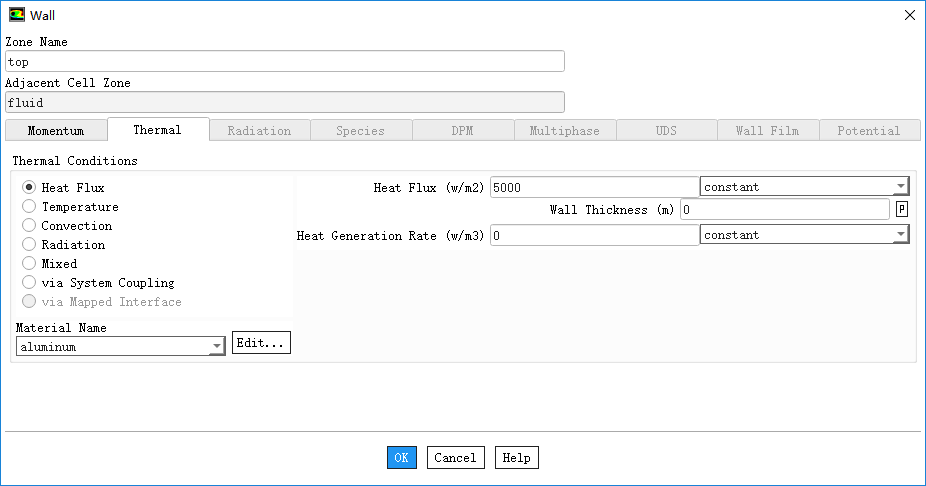 Thermal标签页设置Heat Flux为5000 w/m2,如下图所示