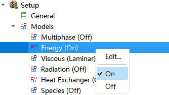 右键选择模型树节点Models > Energy,点击弹出菜单项On激活能量方程